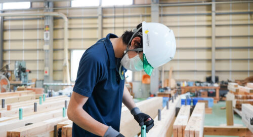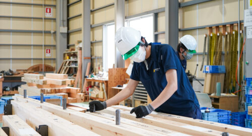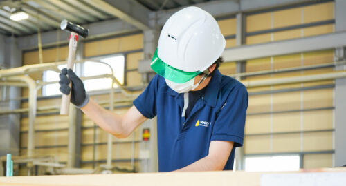 加工した建築材などに釘やボルトなどの金属製の部品(金物)を取り付けて梱包する仕事をしており、他にも金物の仕分けや現場に送る金物の梱包などをしています。取り付ける際には取り付け間違いや不備のないように気をつけて作業に取り組んでいます。